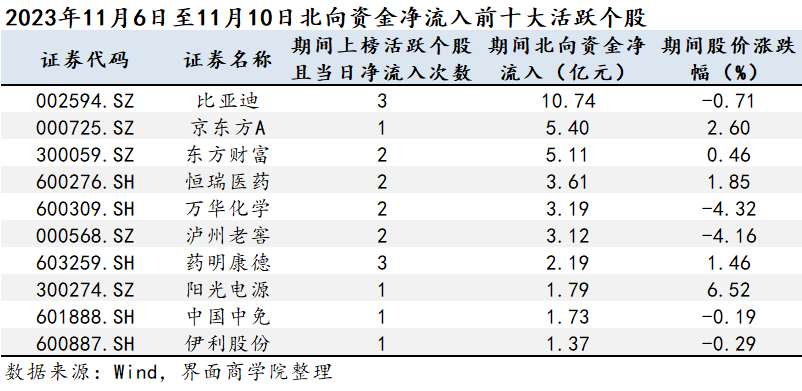 从北向资金活跃个股净流入金额上看,比亚迪(002594.SZ)、京东方A(000725.SZ)、东方财富(300059.SZ)为11月第二周北向资金净流入的前三。