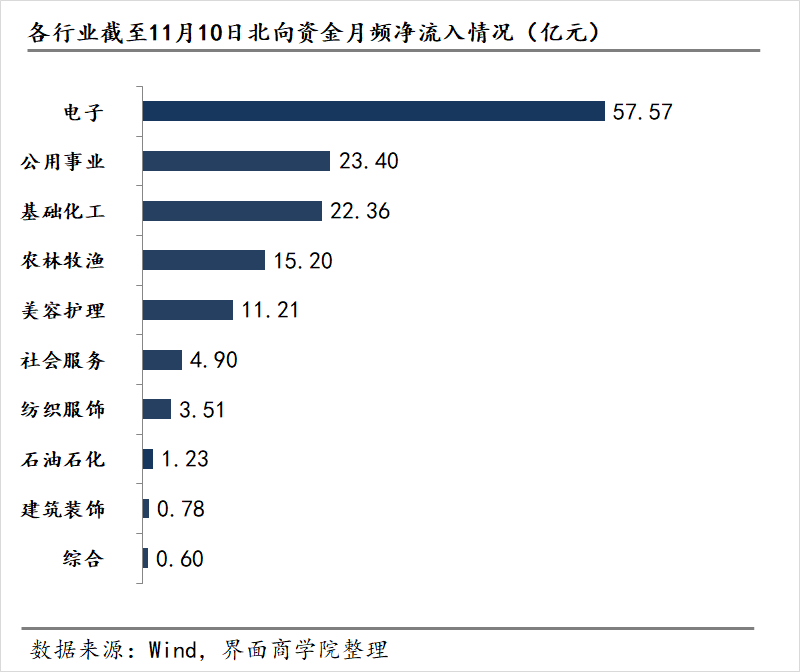 以申万31个一级行业为基准,Wind数据截至11月10日的月频申万一级行业数据显示,北向资金流入显著的前三板块分别为电子、公用事业以及基础化工,月流入分别为57.57亿元、23.4亿元和22.36亿元。而北向资金撤出的前三板块分别为电力设备、机械设备以及有色金属,月流出分别为103.33亿元、49.75亿元与47.74亿元。