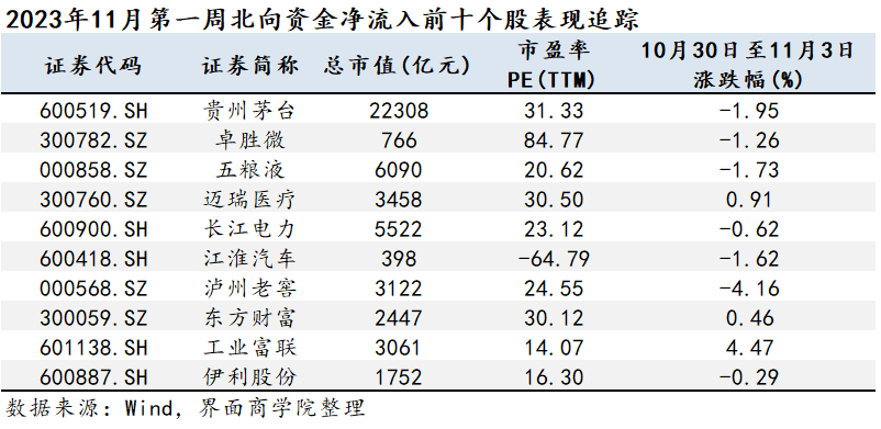 下图为上期2023年11月第一周北向资金净流入前十大个股的后续表现情况。数据截至2023年11月10日,追踪区间为2023年11月6日至11月10日。排序以上期资金净流入为基准。
