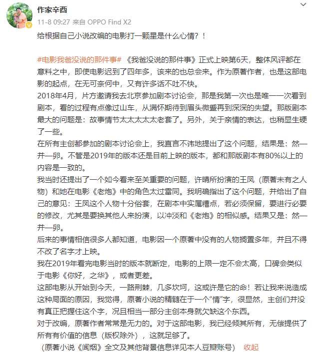 辛酉在文中表示,电影的风评在他意料之中,但作为原著作者“在无可奈何中,又有许多话不吐不快”。辛酉在文中表达了对于电影的诸多不满,例如,他认为电影剧本情节老套,关于亲情的表达稍显生硬;剧本增加了原著没有的角色王凤,而他认为这个角色“十分俗套”,并且也认为许晴不适合饰演该角色,而后电影也因为这个人物搁置多年才更名上映。