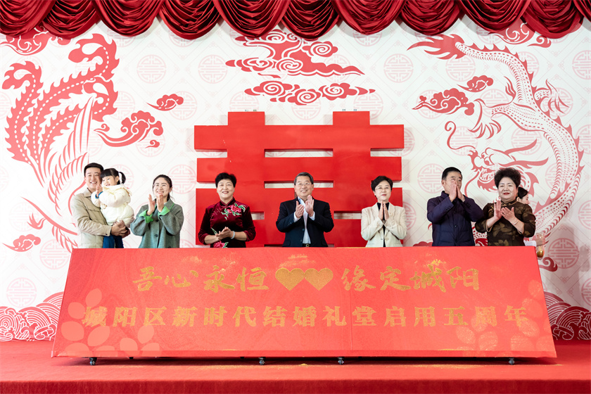 2018年底,青岛市城阳区率先改造建成了全省首家新时代结婚礼堂,礼堂简约时尚、中西结合、富有喜庆感仪式感。五年时间,先后有300余对新人踏上结婚礼堂的红毯,步入婚姻生活,他们传承发扬着新时代家风理念,也让新时代婚礼真正引领婚庆新时尚。