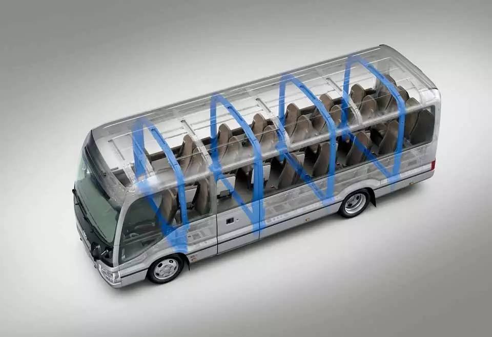 1、新一代柯斯达采用了环式车身架构,前后一共四个以高强度钢板制成的环状骨架,将车顶、车侧和车底结为一体,保障了车辆遭遇翻滚时的安全性;