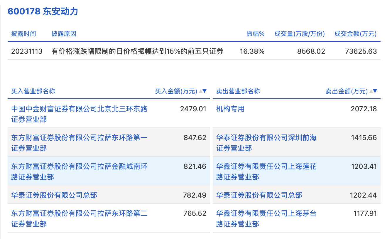 11月13日,东安动力今日跌3.78%,龙虎榜数据显示,上榜营业部席位全天成交1.28亿元,占当日总成交金额比例为17.34%。其中,买入金额为5696.11万元,卖出金额为7071.6万元,合计净卖出1375.49万元。