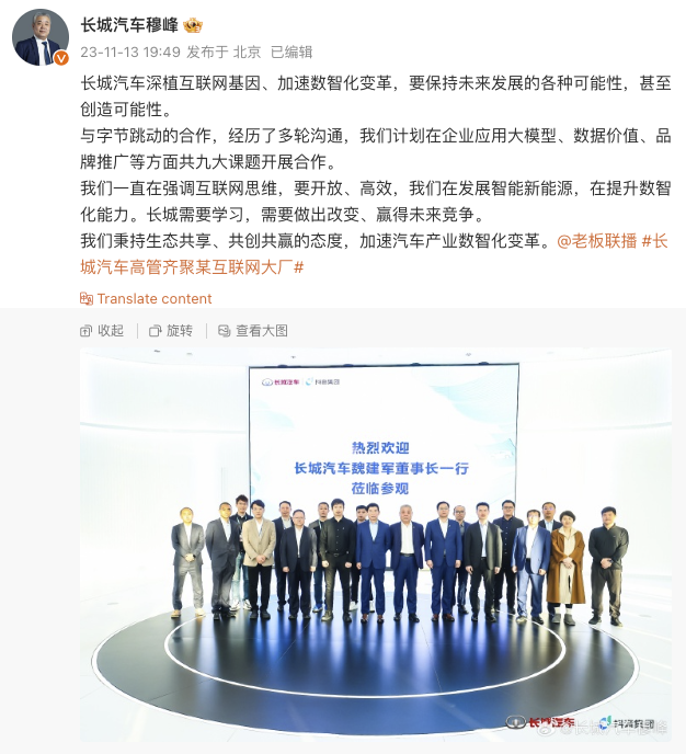11月13日,长城汽车总裁穆峰在微博发文透露,长城汽车与字节跳动的合作,经历了多轮沟通,计划在企业应用大模型、数据价值、品牌推广等方面共九大课题开展合作。