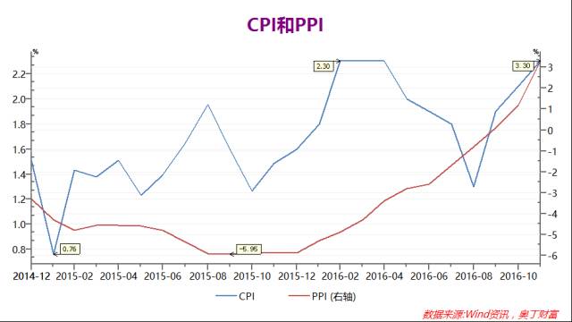 据国家统计局数据显示,PPI从2016年1月起开始扭转前期连续42个月的负增长态势,开始持续上涨,并且超越市场预期,伴有加速迹象。与此同时,CPI强势回升,从1.0时代逐步回升2.0时代。一时间,通货膨胀成了当下宏观经济的热词,市场开始担忧“是否加息”的问题。(参考下图)