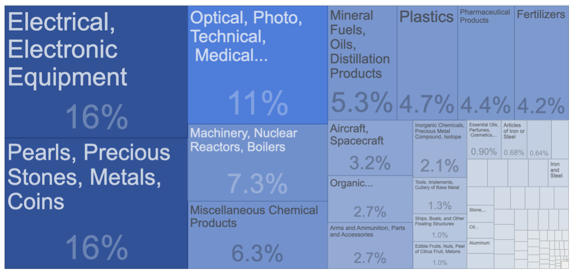 根据联合国商品贸易统计数据库的统计,以色列的主要出口产品包括电子元器件、贵金属、医药品、机械制品、化工产品等。这其中全球可替代性较弱的芯片、钾肥和药品等以色列强势产业对全球供应链的冲击最大。