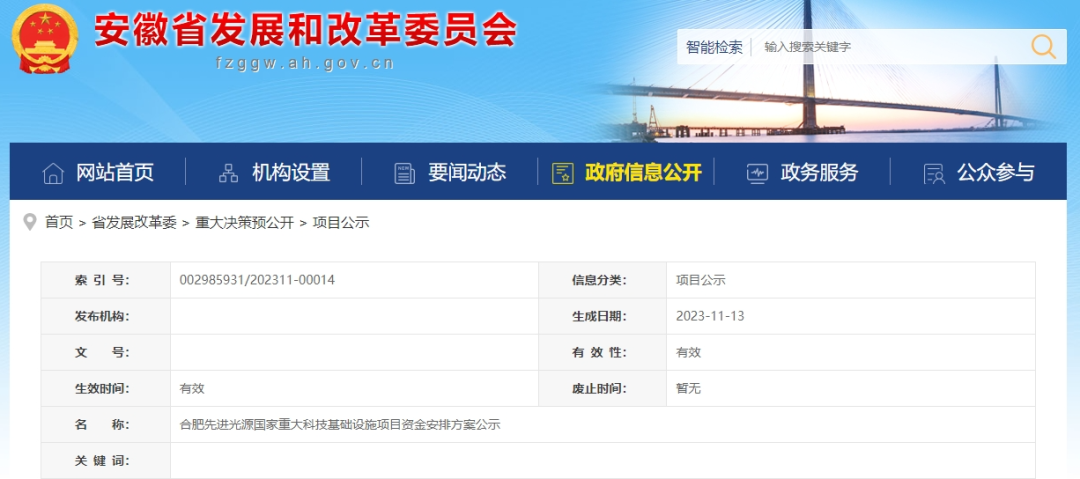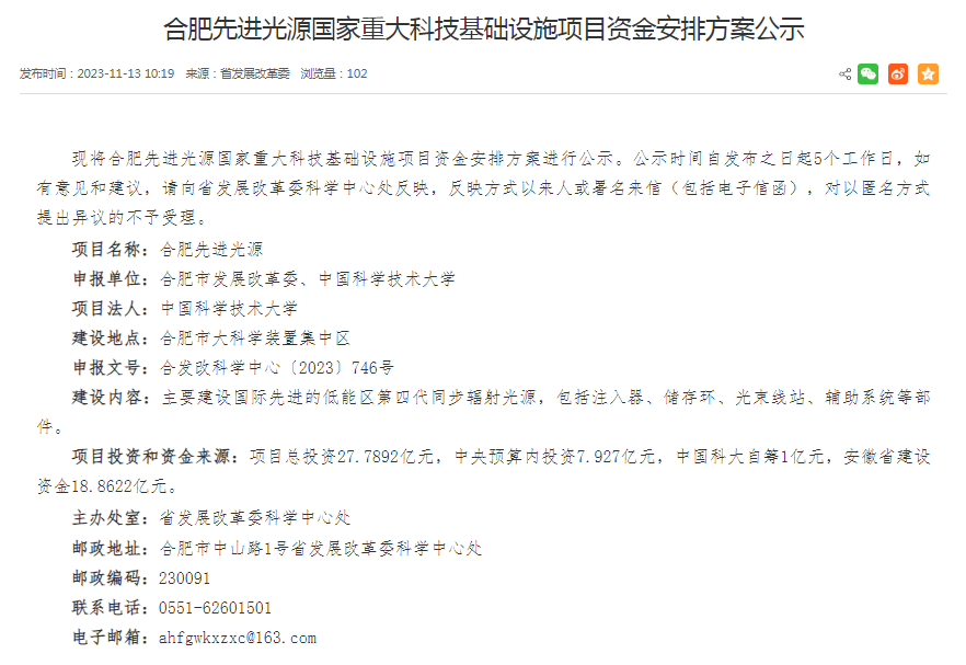 据合肥日报消息,近日,安徽省发改委对合肥先进光源国家重大科技基础设施项目资金安排方案进行了公示,