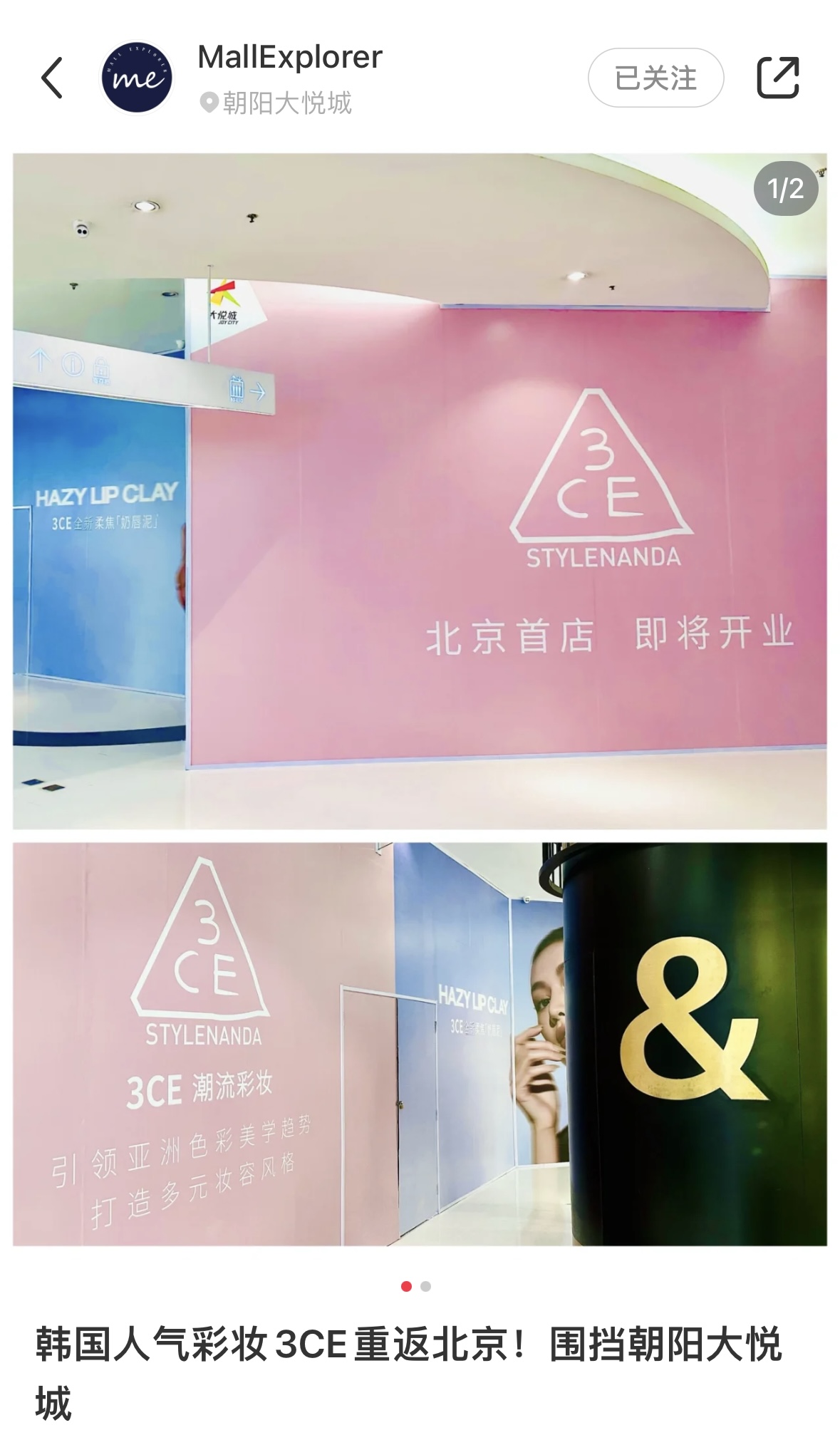 根据小红书多位网友发布的图片,3CE在北京朝阳大悦城立起围挡,并标注“北京首店”的字样。实际上,这并不是3CE第一次在北京开店。3CE初入中国市场时,该品牌曾选址北京三里屯落户首家旗舰店。