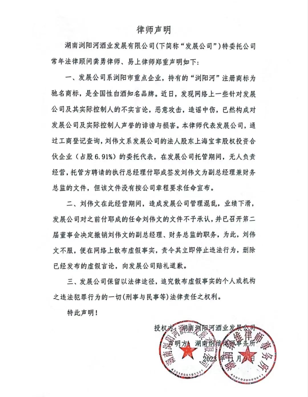 声明授权方为湖南浏阳河酒业发展公司,文内主要指出,刘伟文在经营期间,造成发展公司管理混乱,业绩下滑;发展公司对之前付耶成的任命刘伟文的文件不予承认,并已召开第二届董事会决定撤销刘伟文的副总经理、财务总监的职务;为此,刘伟文不服,便在网络上散布虚假事实,(发展公司)责令其立即停止违法行为,删除已经发布的虚假言论,向发展公司赔礼道歉。
