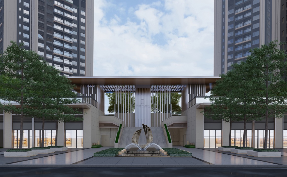·归家第一步:在小区门口,第一眼看到的是天健和瑞府打造的全金属门楼,营造出视觉上轻盈通透感的同时兼顾质量的耐久性;波光喷泉和“光明之翼”雕塑矗立在中央,石阶壁影,气势恢宏中透露一丝奢华。