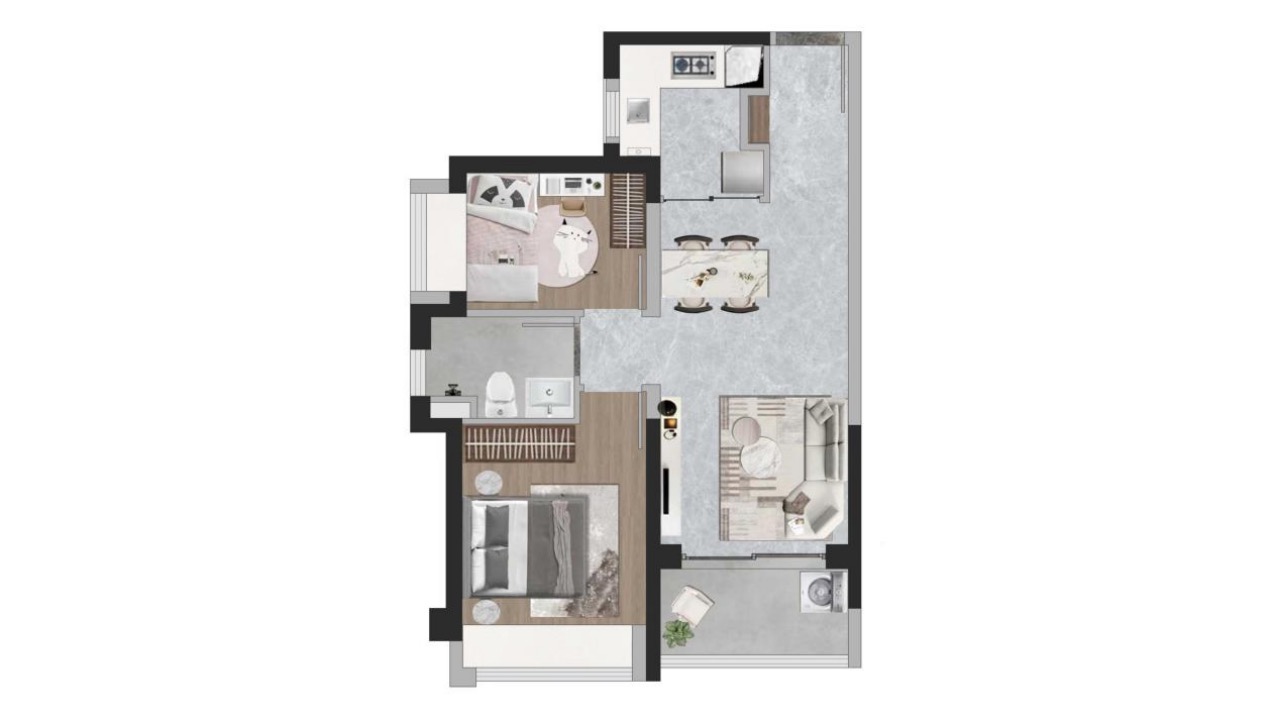 厨房、餐厅、客厅、阳台一体化设计,保证了采光通风、视野更开阔。两个卧室均带飘窗,方便采光通风的同时,也可以用作小家庭的收纳空间。