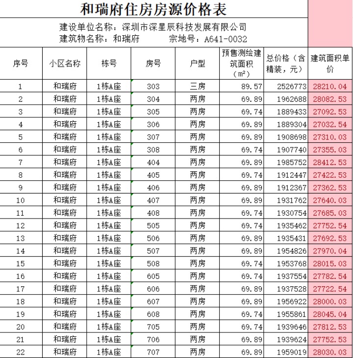 价格方面,查询深圳住建局发布的和瑞府人才房配售价格表发现,项目精装价格26783元/平起,单价在28500元/平以下的,有超600套房源可供选择,包括两房和三房两种房型。