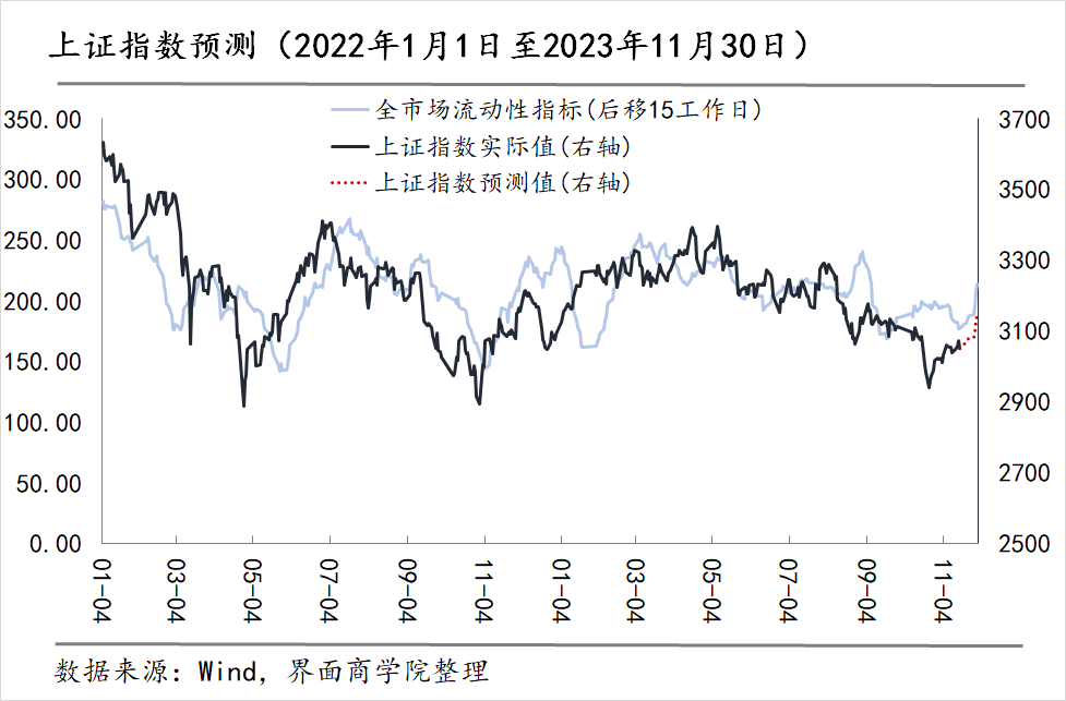 对于11月下半月(11月17日至11月30日)的走势,我们以重置后全市场流动性指数后移15个交易日作为上证指数变动预测的依据,可以看到后移的流动性指数与上证指数的吻合度相对较高。