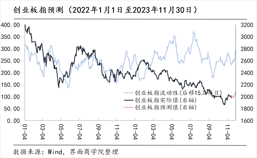 同时通过计算,我们将重置后创业板指流动性指数后移15个交易日作为创业板指变动预测的依据。