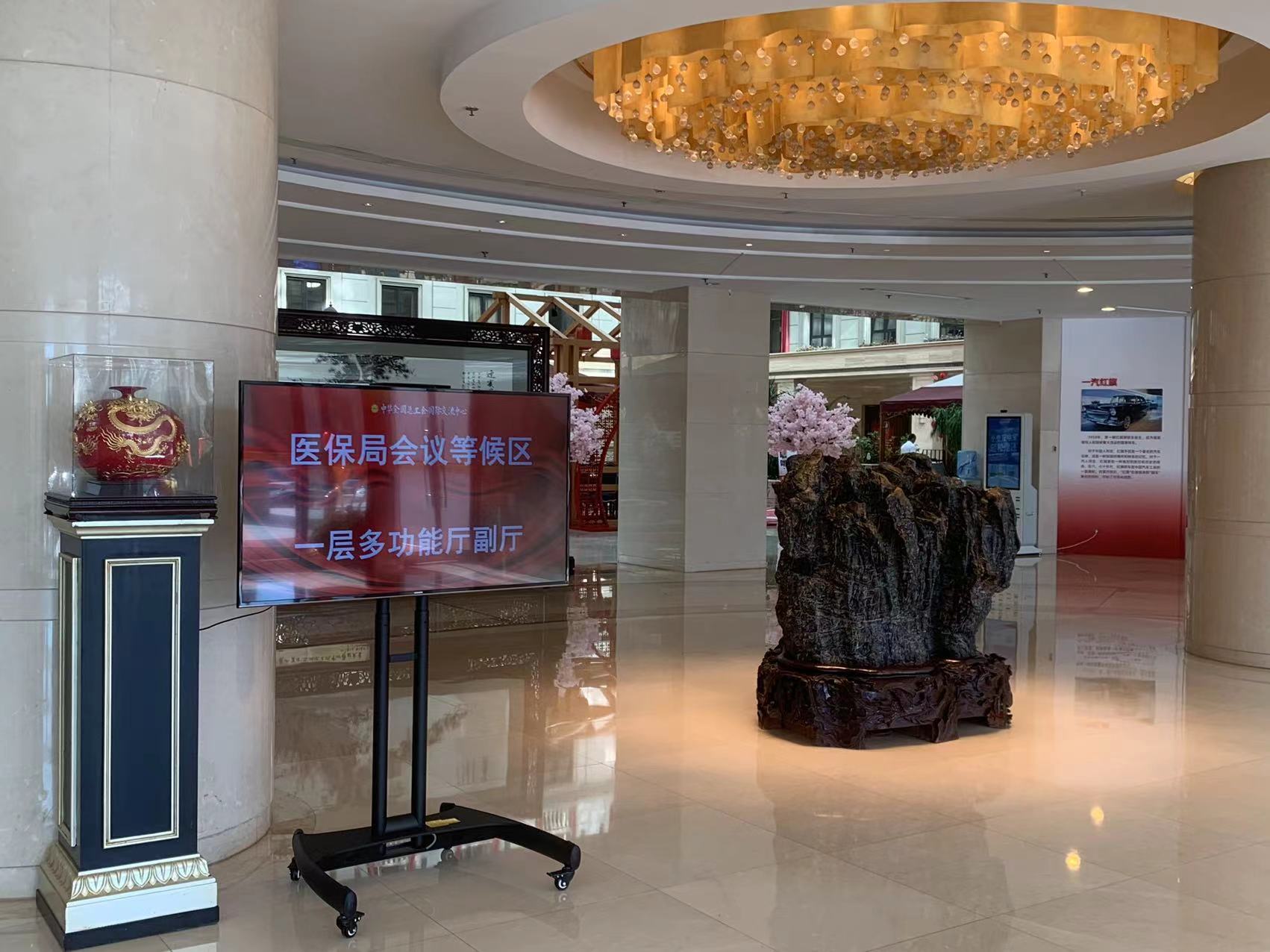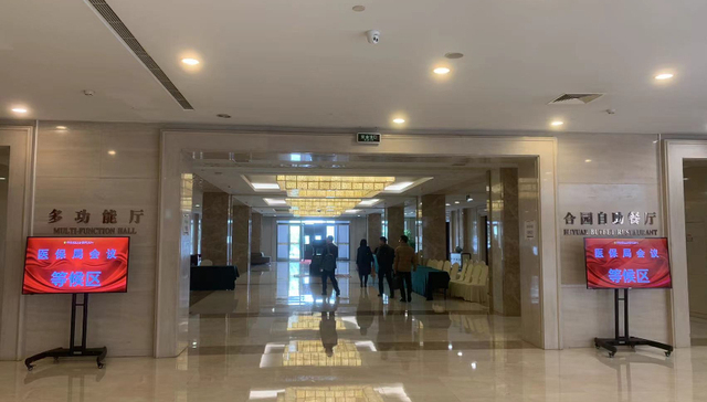 此次谈判的具体地点位于北京全国总工会国际交流中心。该场地同日还举办着羽毛球赛、企业座谈会等各项活动。在一楼大堂内,电子屏上提示着今日发生在此的会议。其中,“医保局会议等候区”位于一层多功能厅副厅的提示赫然在目。这也是医保谈判的具体场所。