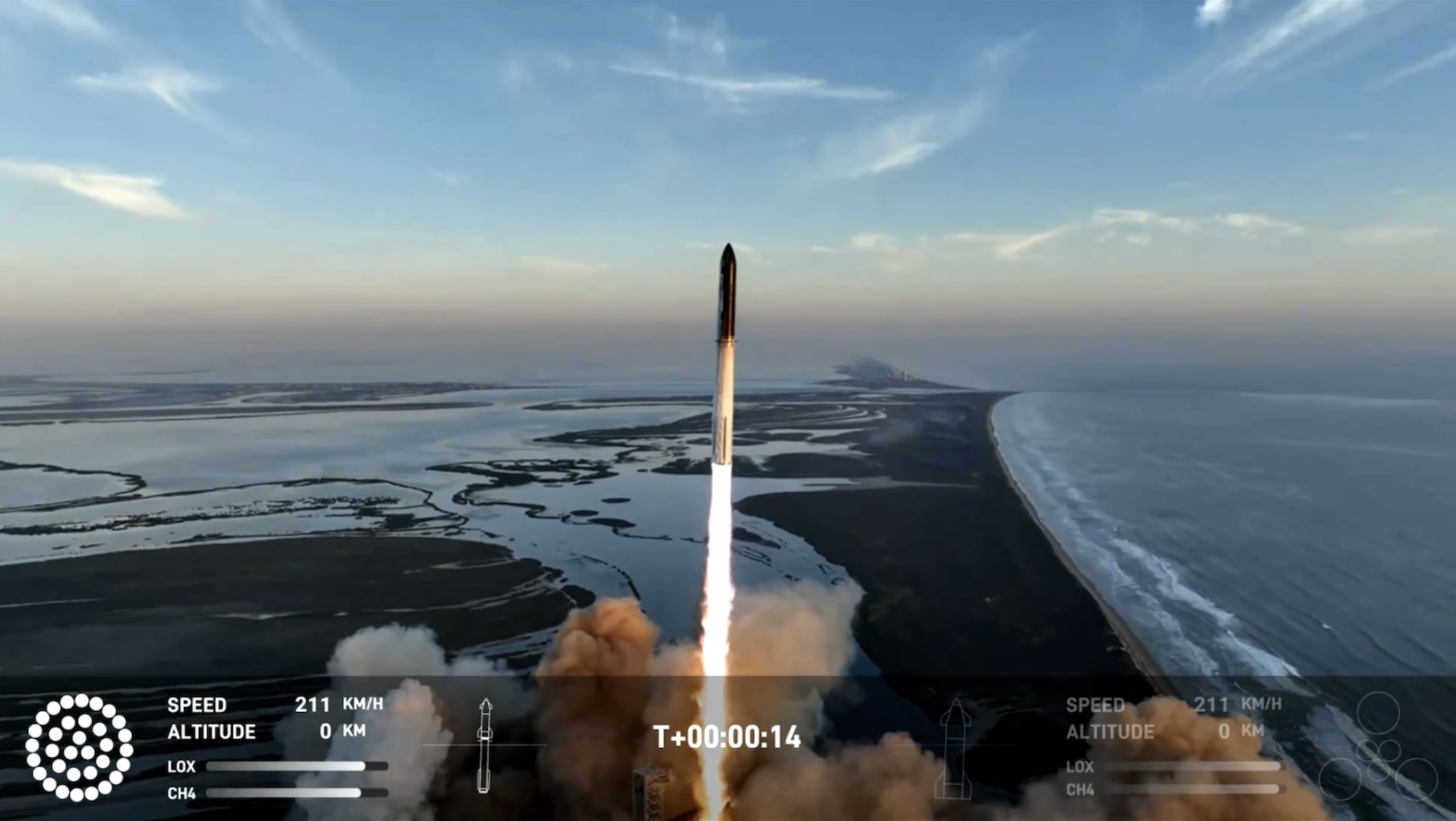 在倒计时还有40秒时,星舰发射一度停滞,随后一两分钟后继续。发射时33台发动机均正确启动,星舰顺利升空。
