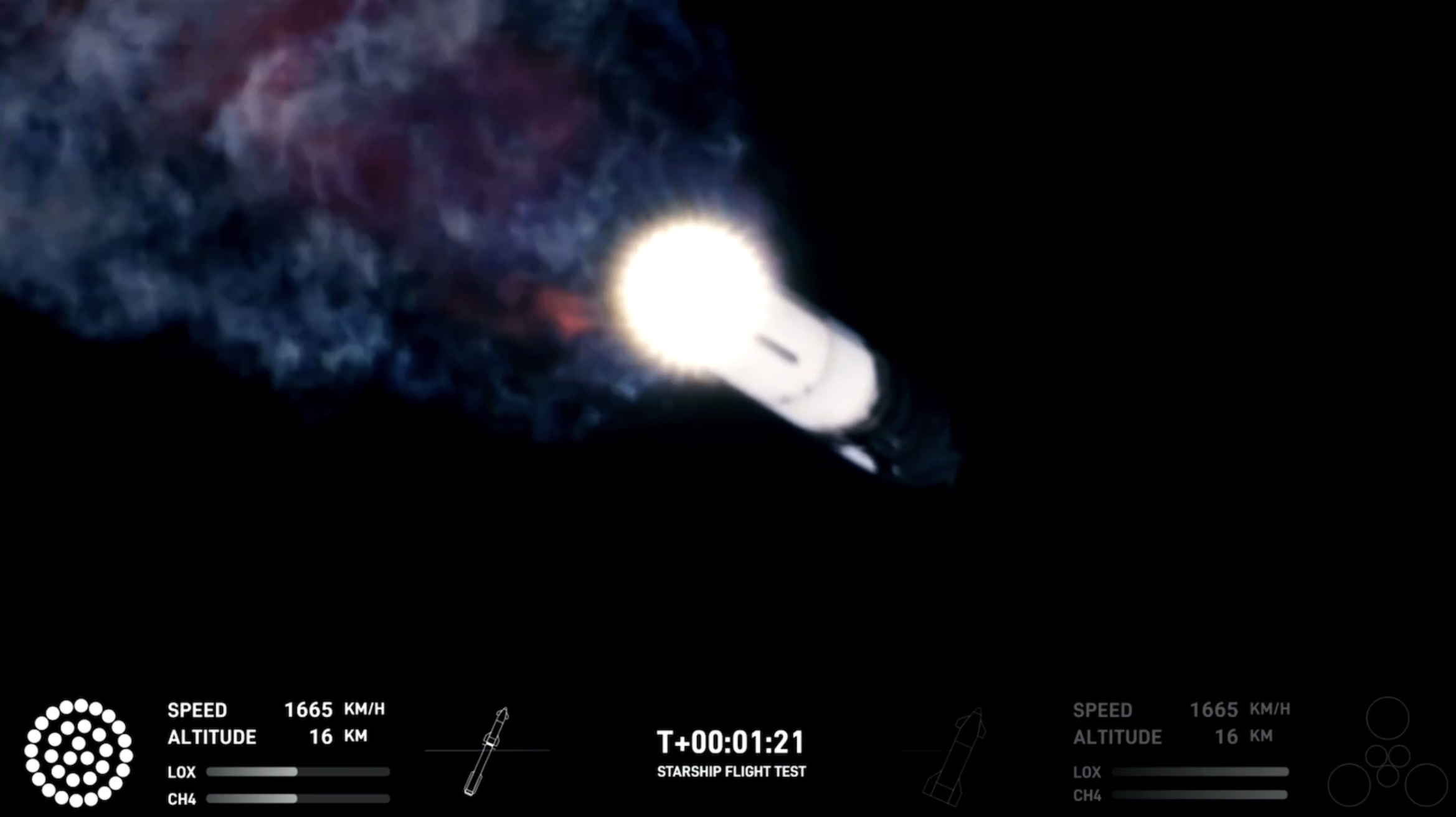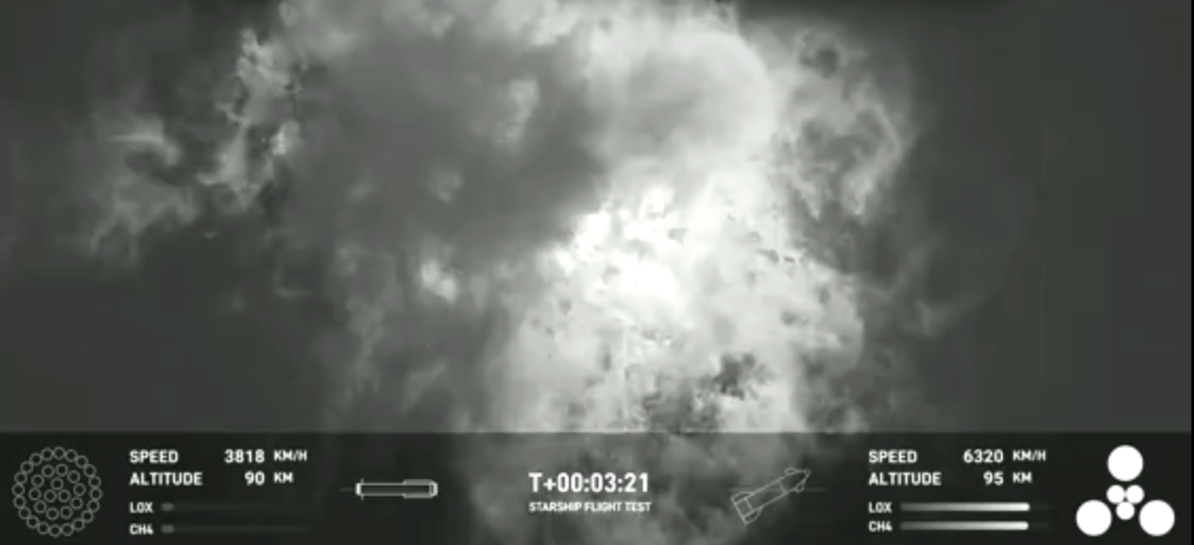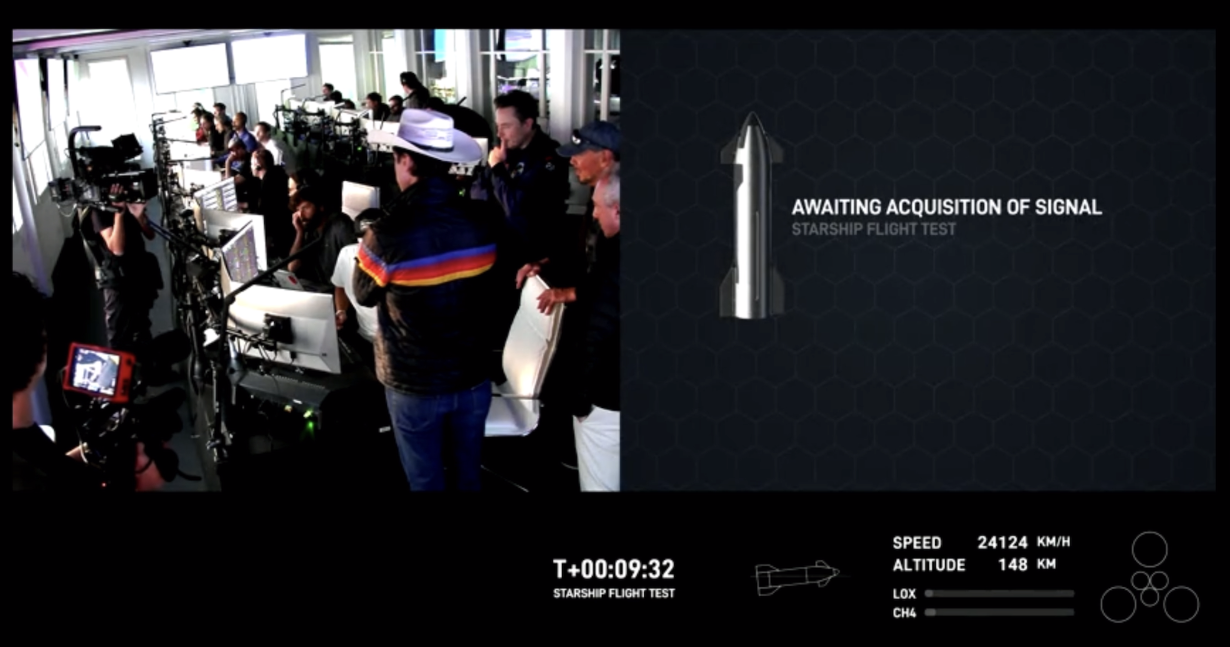 但在火箭升空3分钟后,直播出现疑似爆炸的画面。发射进行到9分32秒时,直播画面显示“AWAITING ACQUISITION OF SIGNAL”(等待信号采集),屏幕下方的星舰速度停留在24124 KM/H,高度148 KM。