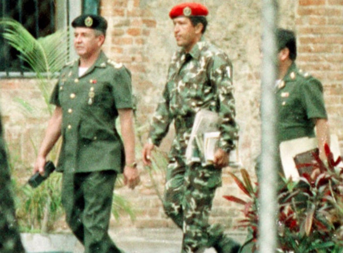 19. 这张照片摄于1992年,主人公是中校查韦斯(中),走在他身边的是军事情报部门的官员。他当时因在一场军事政变中试图推翻委内瑞拉政府被捕。数年后,他被选为委内瑞拉总统。