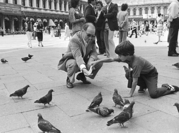 6. 这张拍摄于1980年的照片中,那个8岁的孩子是现任加拿大总理特鲁多,当时他正与时任加拿大总理的父亲一起在威尼斯喂鸽子。