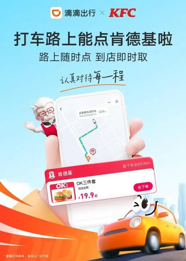 近日,滴滴出行和肯德基达成战略合作,在全国范围内上线 “打车途中快捷点餐”服务。该服务可以帮助用户高效利用乘车时间,简化“打车+点餐”的操作流程。目前,该服务已覆盖全国近万家肯德基门店,用户在滴滴App及小程序内呼叫快车、特惠快车、特快、优享订单均可在行程中体验该服务。(品牌官方)