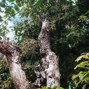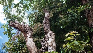 甚至还有少许古茶树由于历史原因,它们在多年前有过被齐根砍断的经历,但由于生命力旺盛又不断长出新树枝,现在我们看到某些古茶树的样子其实是重新萌发的新枝。新长出来的枝桠相对而言比较小,就像下图这样:
