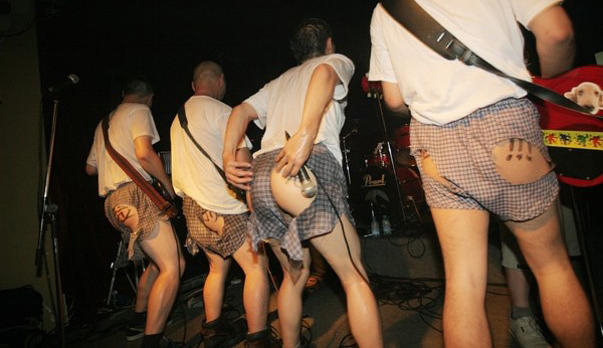 2005年7月我们第一次演朋克,在上海的哈雷酒吧,连空调都没有,巨热无比,墙都在流眼泪。陆晨把头发弄成前后都是尖的,穿了条游泳裤COS阿童木,其他人每人穿一条内裤,屁股上挖两个洞,一边屁股一个字,依次写“阿拉顶顶朋克”(上海话,我们最朋克),鼓手戴了个红色的胸罩,打算COS林志玲。我们翻唱了几首歌,包括S.H.E.的《SUPER STAR》,把自己的歌也改成了朋克,还专门写了一首新歌叫《我们很愤怒》,因为朋克必须愤怒!