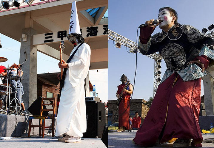 朋克音乐节的演出,我化装成白无常,陆晨化妆成僵尸,穿清朝官服,上海京剧院的一个哥们儿给他画了大白脸。吉他手猩猩走了,原本就是吉他手的中科又成了吉他手,他穿了一身喇嘛服,新鼓手晓零穿了一套睡衣,带着《惊声尖叫》的面具。后来,这种每次大专场或音乐节都定制演出服的习惯一直保留着。
