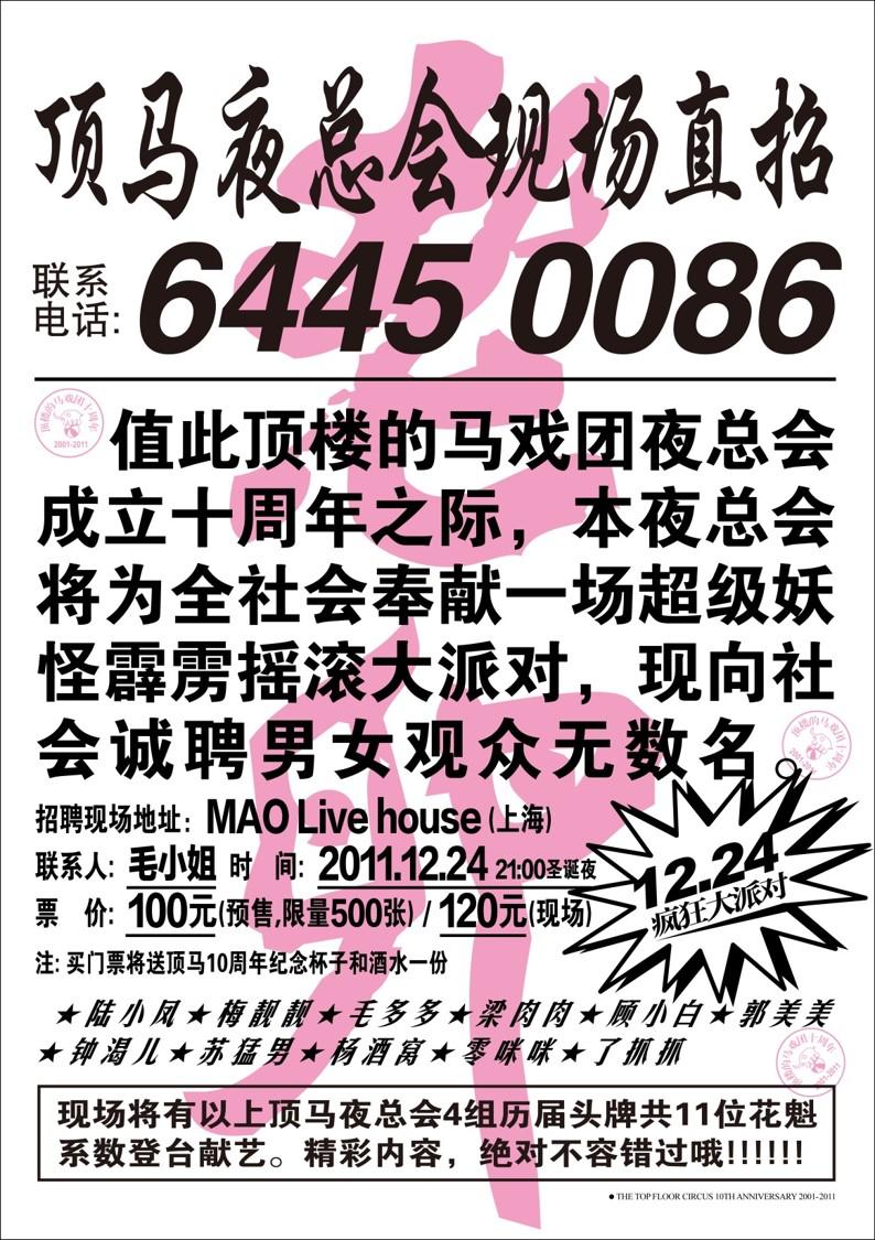 后来,好多宣扬上海地方文化保护的人把顶楼的马戏团挂出来做典型。其实我们的歌里有很多嘲讽上海人的内容,很多人听了反感。有人在微博上一通骂,说我们是“沪奸”乐队,由一群“三校生”(中专,职高,技校)组成,文化素质极低。我们转了那条微博,就又来了一批“三校生”,质问道:“三校生”怎么了?