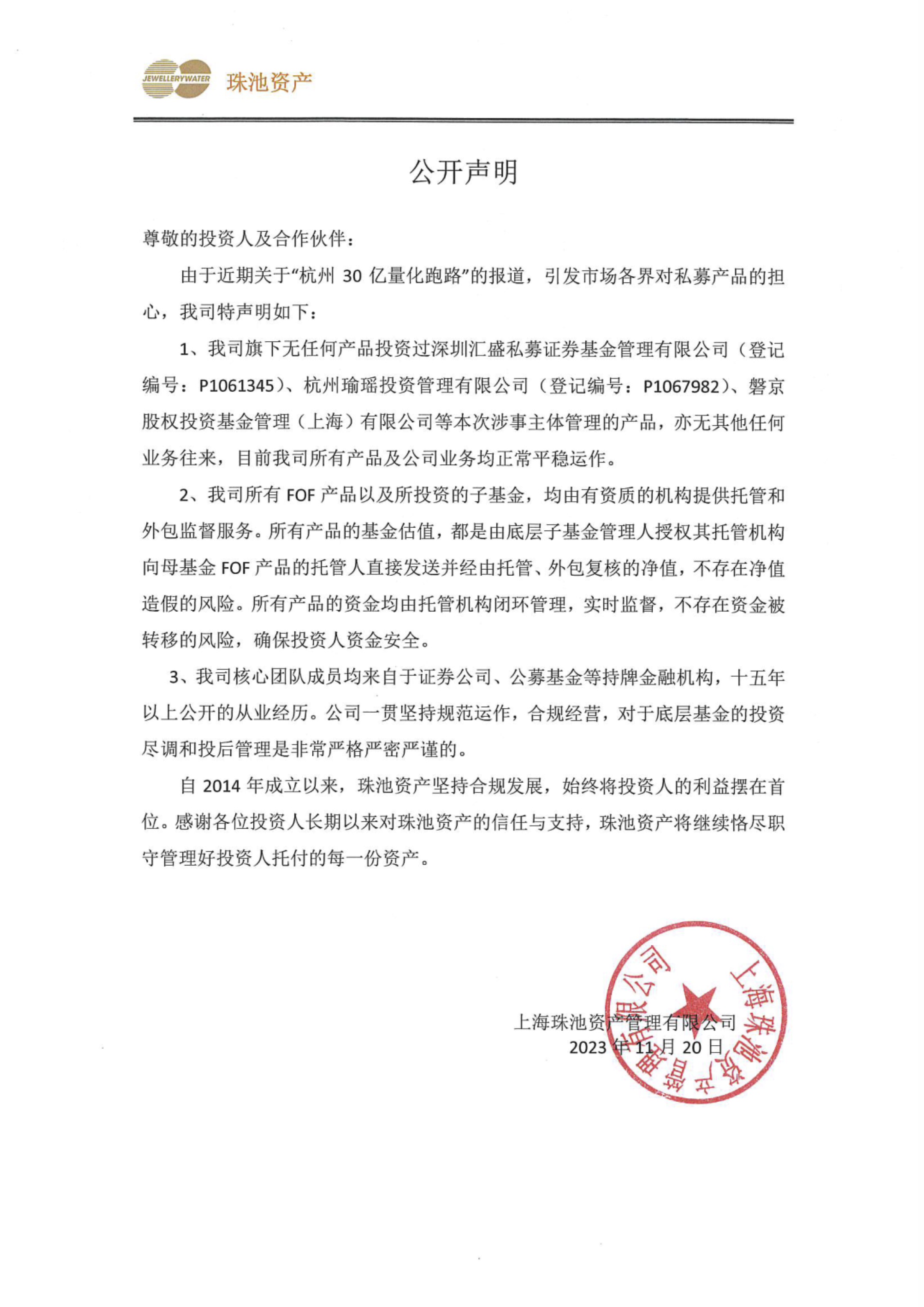 “杭州30亿量化跑路”持续发酵,市场传言“上海有家私募FOF也涉及此事,且与华软新动力情况类似”。11月20日,上海珠池资产官微发布声明称,旗下无任何产品投资过深圳汇盛、杭州瑜瑶投资、磐京投资等本次涉事主体管理的产品,亦无其他任何业务往来。珠池资产称,目前所有产品及公司业务均正常平稳运作,公司所有FOF产品以及所投资的子基金,均由有资质的机构提供托管和外包监督服务,不存在资金被转移的风险;所有产品的基金估值不存在造假风险。