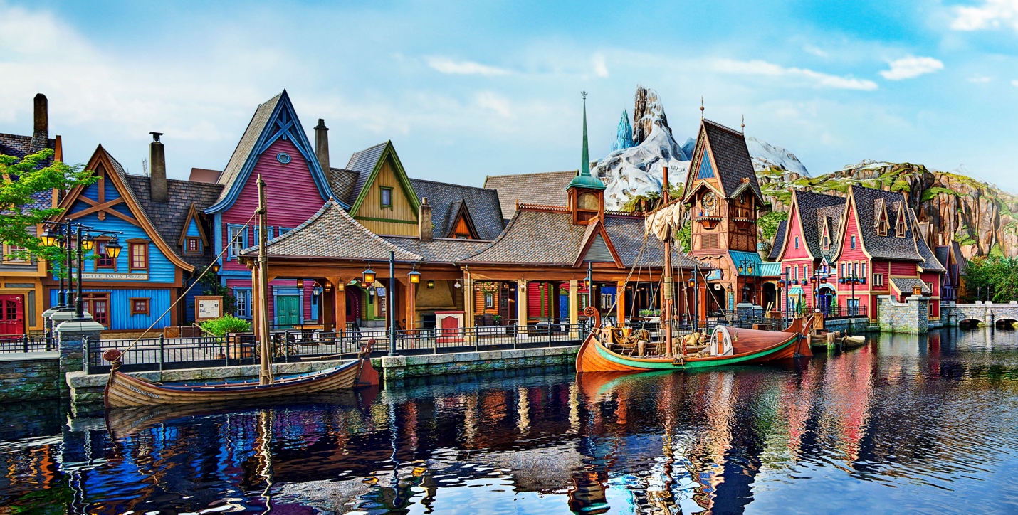 “魔雪奇缘世界” 整个园区的核心,正是片中的阿伦黛尔小镇、城堡,以及远处北山上的冰雪皇宫。在游玩项目上,主要包含了“森林小天地”的一场互动沉浸式演出,和两个主要项目——“魔雪奇幻之旅”和“雪岭滑雪橇”。