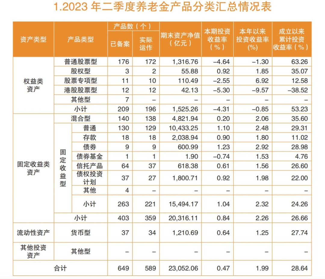 人社部数据显示,截至今年二季度末,全市场已备案的养老金产品数量多达649个,其中实际运作的产品达到589个。上述养老金产品期末资产净值合计接近2.31万亿元,其中,固定收益类资产规模超过2.03万亿,是规模最大的细分类型,权益类、流动性资产规模分别为1525.26亿元、1210.69亿元。