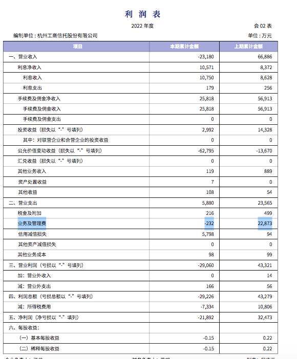 年报显示,受到公允价值变动收益-6.11亿元影响,杭州工商信托2022年的营业收入为-2.02亿元,净利润为-1.98亿元。