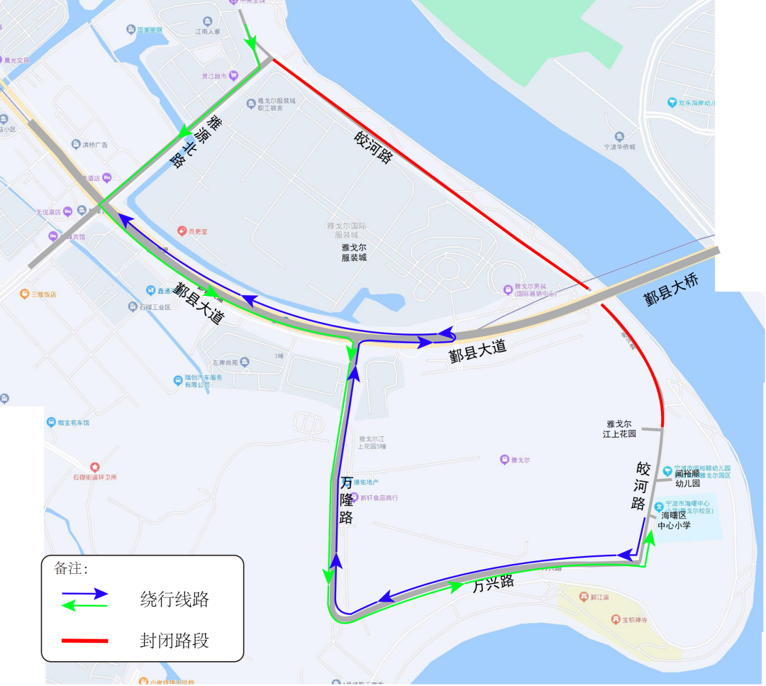 据宁波交警官微消息,为保障海曙区皎河路(雅源北路-鄞县大道下穿)改造工程施工的顺利实施,根据《中华人民共和国道路交通安全法》第三十九条的有关规定,决定自2023年11月23日至2024年5月30日,皎河路(雅源北路-雅戈尔江上花园东门)封闭施工,禁止一切车辆、行人通行,受限车辆、行人通过万兴路-万隆路-鄞县大道-雅源北路绕行。