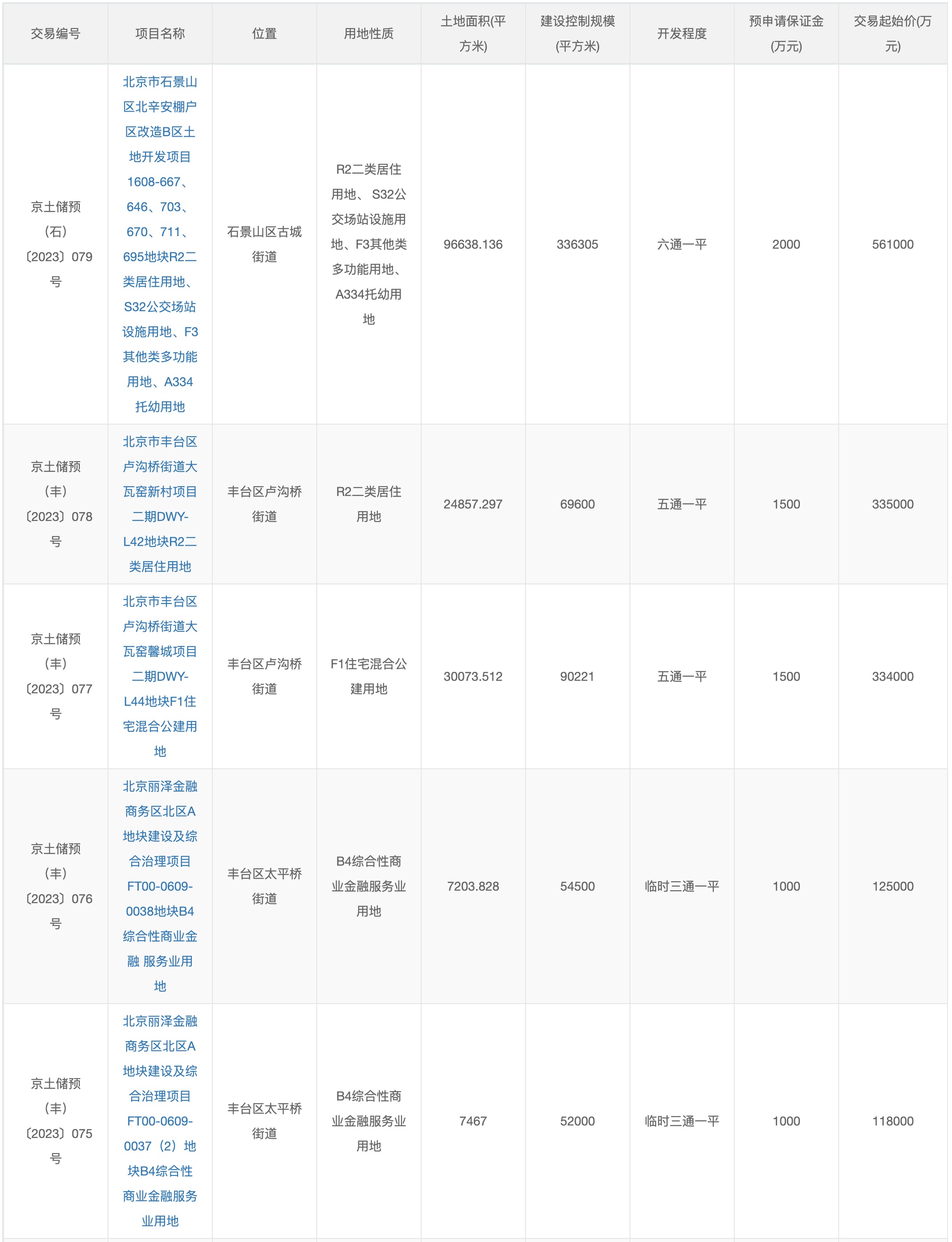 其中,石景山区北辛安棚户区改造B区土地开发项目1608-667、646、703、670、711、695地块出让面积约9.66万平方米,属R2二类居住用地、S32公交场站设施用地、F3其他类多功能用地、A334托幼用地,起始价56.1亿元;丰台区卢沟桥街道大瓦窑新村项目二期DWY-L42地块出让面积约2.5万平方米,属R2二类居住用地,起始价33.5亿元;丰台区卢沟桥街道大瓦窑馨城项目二期DWY-L44地块出让面积约3万平方米,属F1住宅混合公建用地,起始价33.4亿元;丽泽金融商务区北区A地块建设及综合治理项目FT00-0609-0038地块出让面积7203.83平方米,属B4综合性商业金融服务业用地,起始价12.5亿元;丽泽金融商务区北区A地块建设及综合治理项目FT00-0609-0037(2)地块出让面积约7467平方米,属B4综合性商业金融服务业用地,起始价11.8亿元。