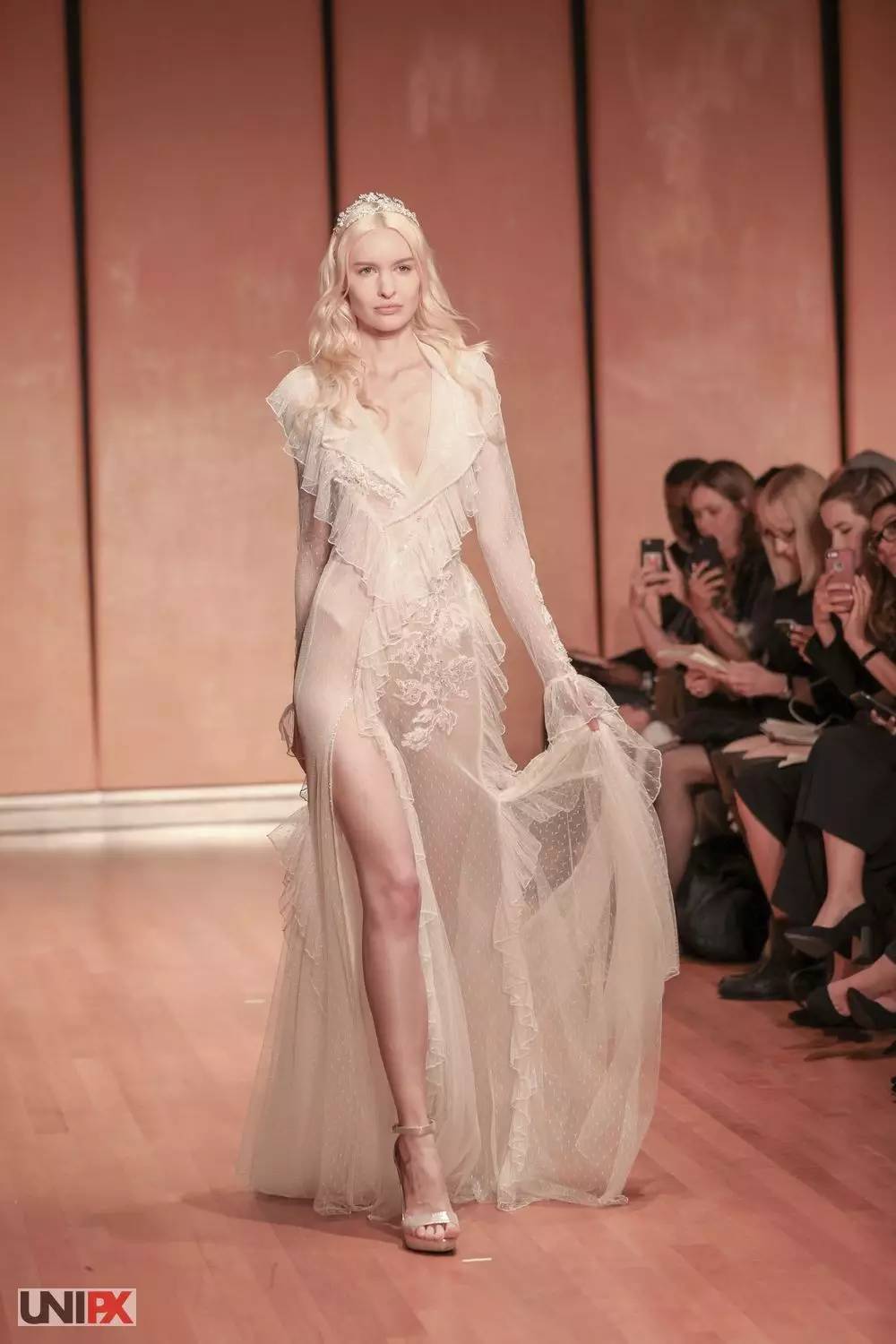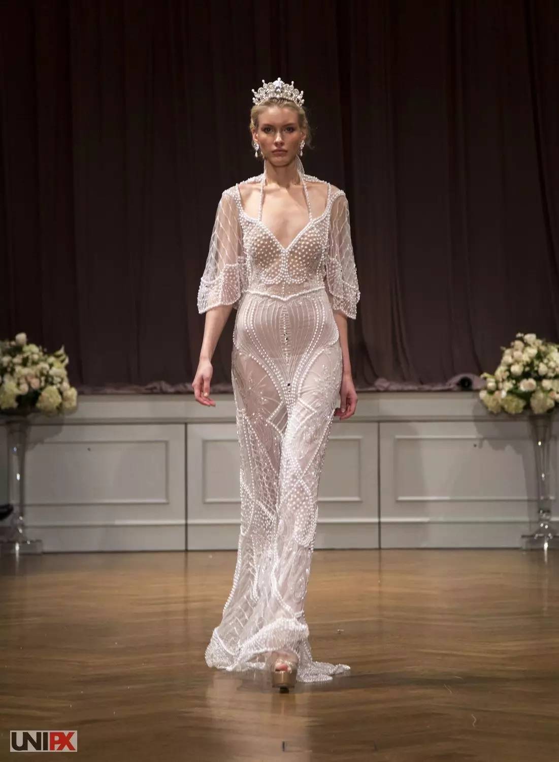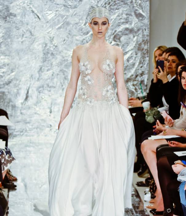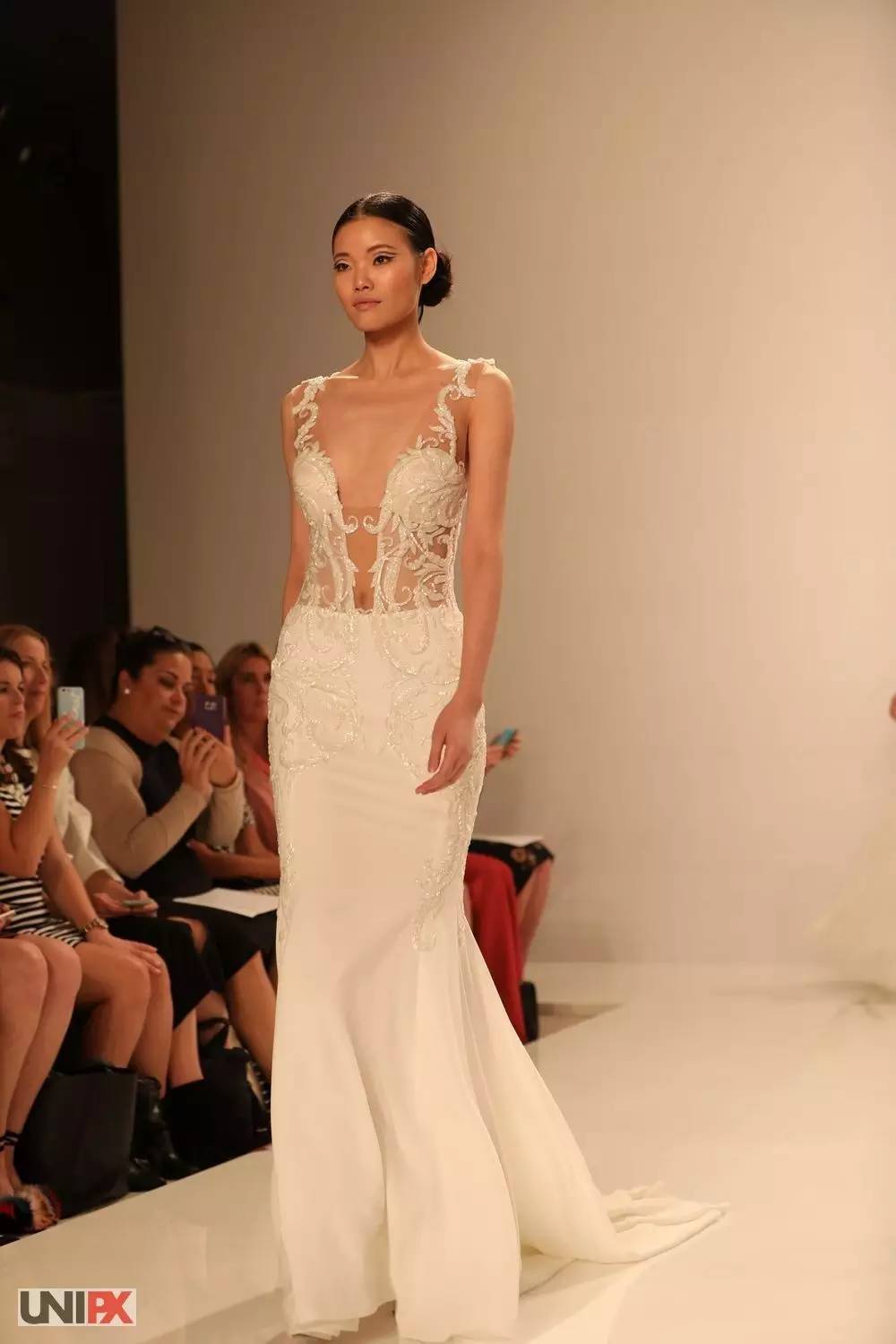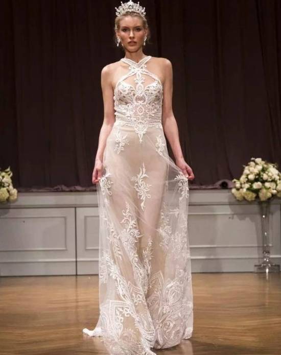 透视装也出现在本次婚纱周,一袭水晶感十足的修身长裙,足以衬托新娘完美的身材,但是小编还是想问:这样的婚纱是要给谁看的?反正不止是给老公看的………