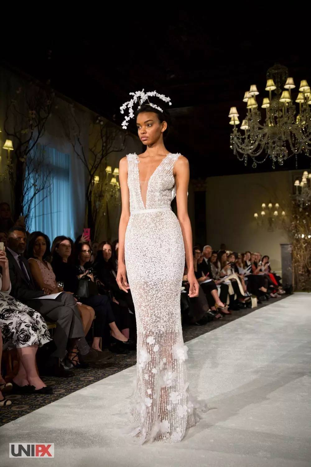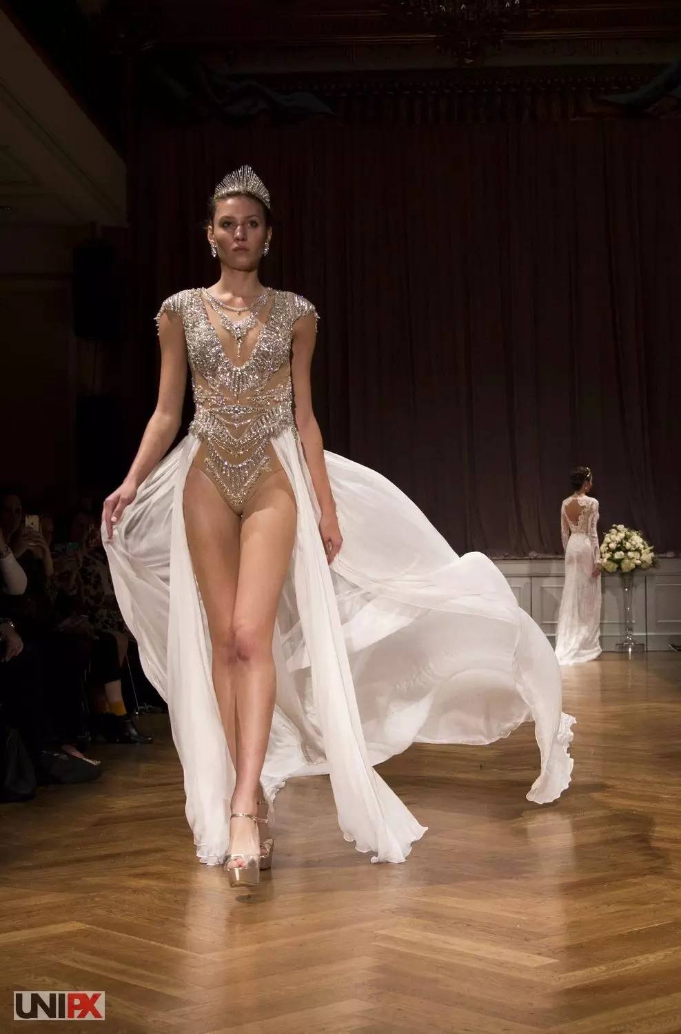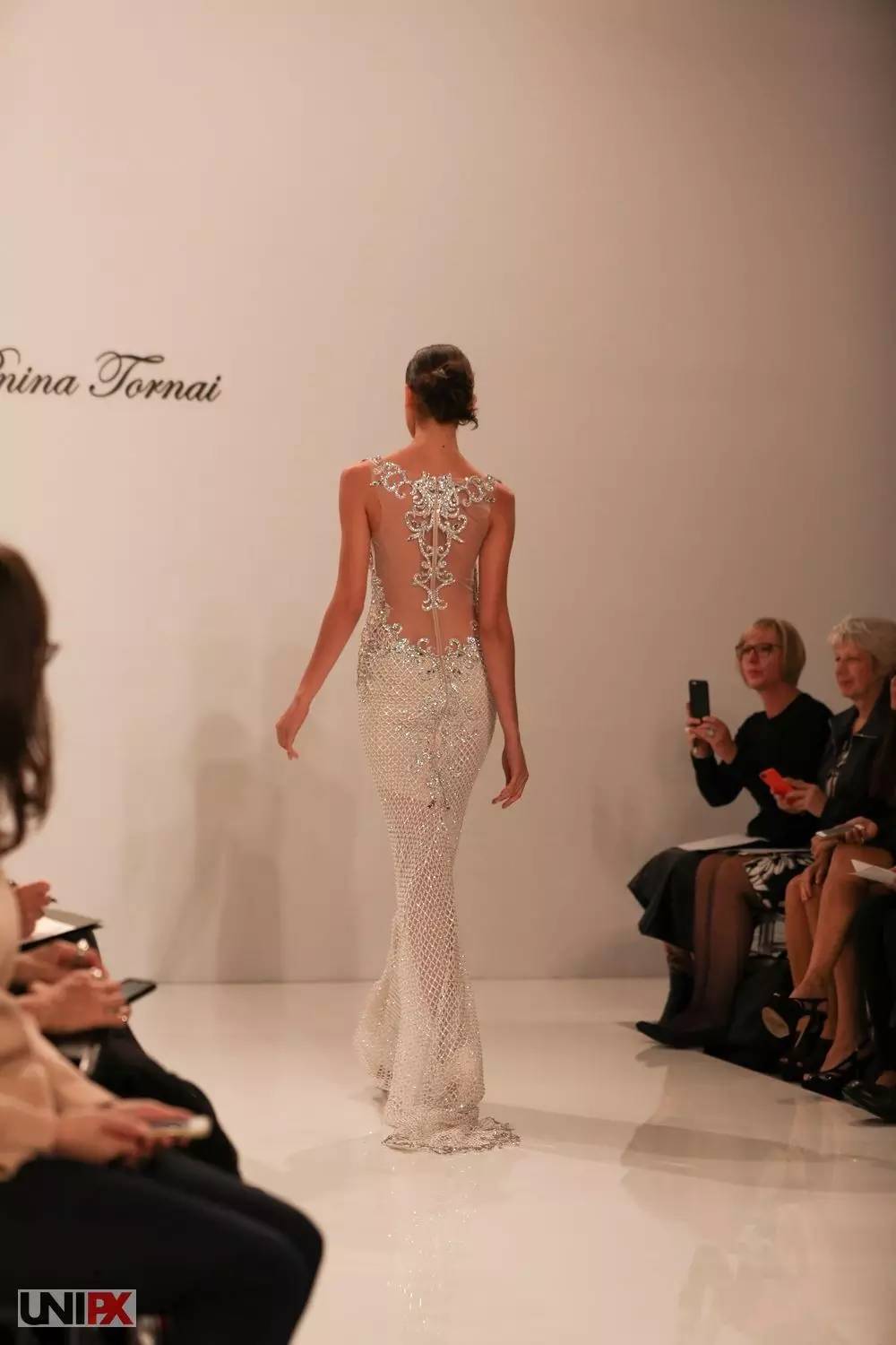 透视装也出现在本次婚纱周,一袭水晶感十足的修身长裙,足以衬托新娘完美的身材,但是小编还是想问:这样的婚纱是要给谁看的?反正不止是给老公看的………