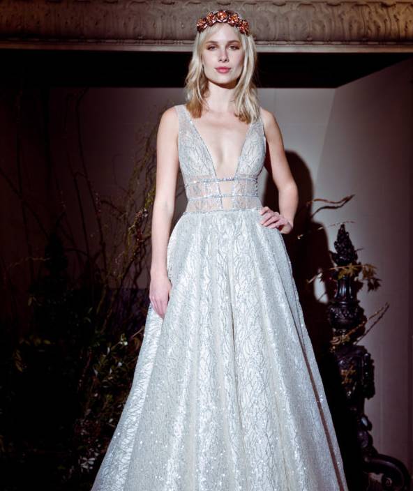 深V也是这次婚纱周的常见风景,有的深V开到胸口还不够,进一步开到了肚脐,加上华丽繁复的蕾丝花纹修饰,雕琢出上半身若隐若现的性感婚纱。