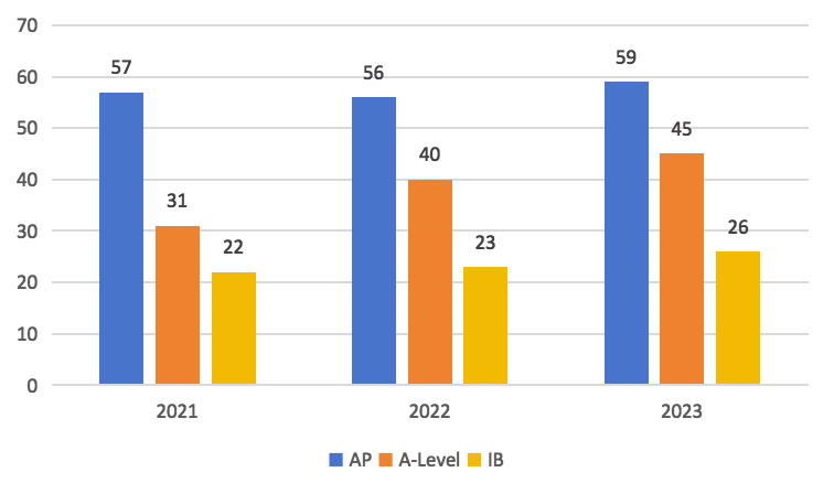 三大主流课程中,AP课程学校最多,有59所。这与《中外合作办学条例》的颁布有关,公立名校国际部多开设AP课程,如北京第四中学国际校区、华南师范大学附属中学国际部均为AP课程。