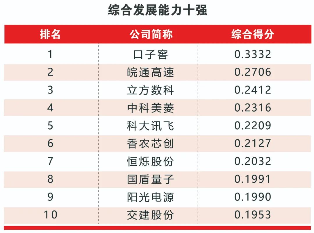从综合发展能力排名看,口子窖凭借较强优势位列榜首,皖通高速表现突出。
