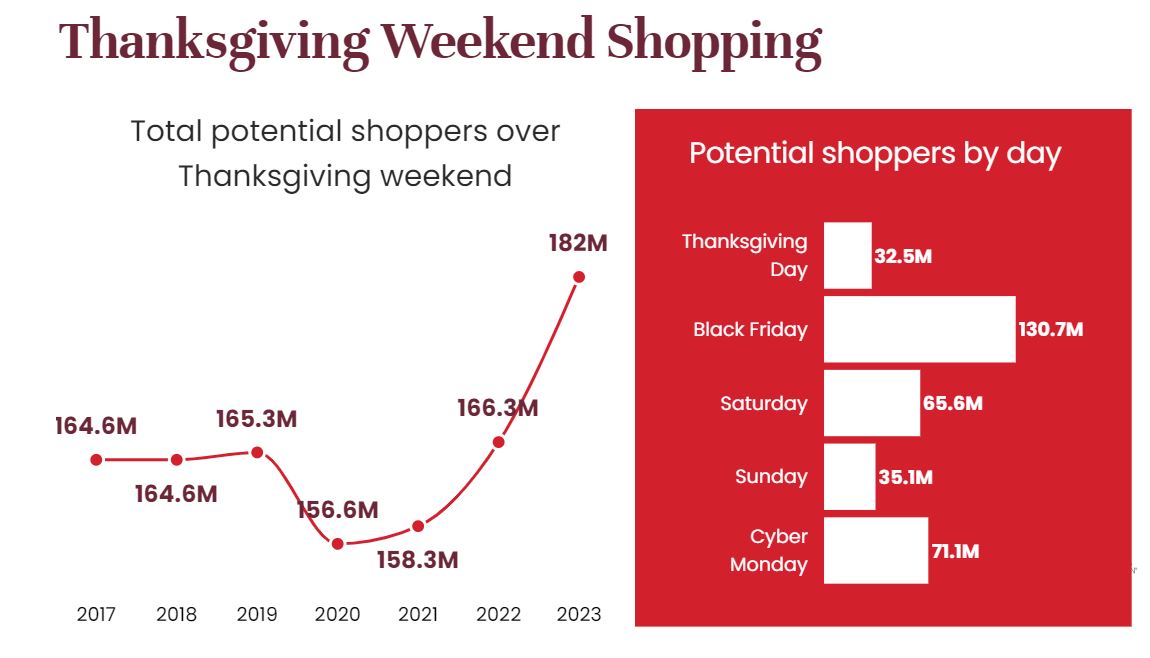 准备在今年假日购物季消费的美国人中有74%将在感恩节到网络星期一期间购物,高于疫情前的69%。“黑五”是最受欢迎的购物日,预计有1.3亿人计划在“黑五”当天购物。网络星期一排名第二,约有7111万美国人准备在当天购物。