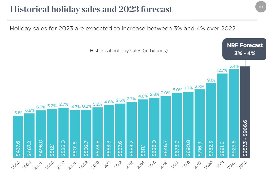 美国零售联合会统计显示,2020年美国的假日购物季销售额同比上涨9.1%,2021年的增幅更是达到破纪录的12.7%。2022年,随着通胀攀升,假日销售额增长放缓,同比增幅5.4%,但也超过疫情前的增长速度。
