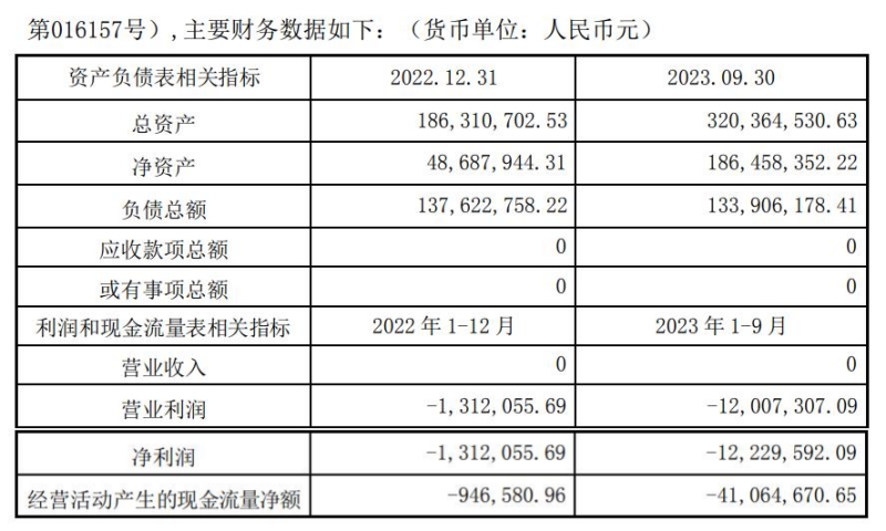 根据公告,北京绿钒设立于2022年10月25日,至今仅一年多,注册资本为1600万元,实收资本800万元。其主要财务数据显示,2022年全年以及2023年1-9月均未实现营业收入,净利润分别为-131.21万元和-1222.96万元。