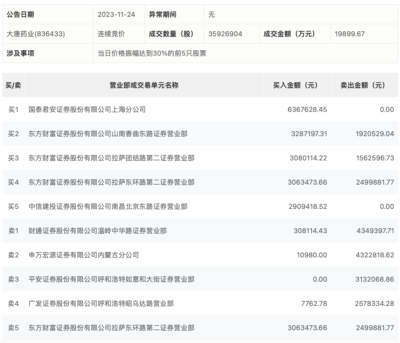 11月24日,大唐药业今日涨27.38%,全天换手率达21.24%,振幅达40.78%。龙虎榜数据显示,营业部席位合计净卖出133.09万元。其中,国泰君安证券上海分公司、东方财富证券山南香曲东路证券营业部分别买入636.76万元、328.72万元;财通证券温岭中华路证券营业部、申万宏源证券有限公司内蒙古分公司分别卖出434.94万元、432.28万元。