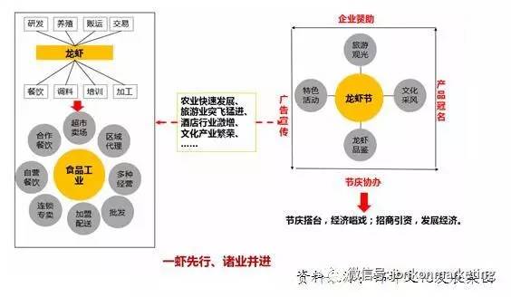 与此同时,通过盱眙龙虾节为药引子,实施控制品牌抓住产业链上下游“一控两抓”战略和以发展龙虾产业为主体以科技研发和资本运作作为两翼促进产业发展的“一体两翼”战略,催生了养殖、调料、交易、研发、餐饮等多远化经营与一身的盱眙龙虾产业链,并极大的提振了当地的旅游业和服务业。龙虾不但带动了农民增收,还激发了民众全民创业的热情,使得盱眙的可以成为全域旅游的排头兵,盱眙一举由苏北的国家级贫困县成为江苏的小康县。