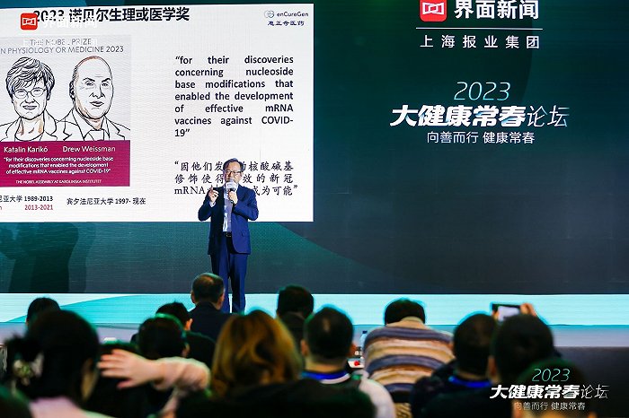 由上海报业集团 | 界面新闻主办的2023【大健康常春论坛】于11月16日在北京柏悦酒店圆满落幕。此次论坛共有有4场主旨演讲及2场圆桌对话,邀请到诸多生物医药领域的专家学者及领军企业的代表出席,围绕AI浪潮下医疗行业的生产力重塑、消费级医疗对商业机会的识别与把握等主题展开深度讨论。宏观经济正缓慢复苏,当此关键时刻,我们更需要静下心来认真听一听他人的洞见。论坛现场,惠正奇医药创始人、董事长兼CEO回爱民发表了mRNA创新药物研发优势与前景为主题的演讲。