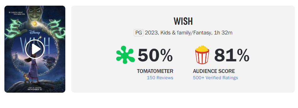 截至《星愿》上映前,迪士尼电影2023年在全球范围内的总票房约为14.08亿美元,比2020年至2022年每年的全年票房高,但远不及2019年和2018年的37.42亿美元和31.35亿美元。此外,据Variety报道,《星愿》不包含宣发费用的制作成本约2亿美元,就目前的表现而言,《星愿》甚至回本艰难,“许愿星”似乎没有像支持亚莎一样回应迪士尼的愿望。