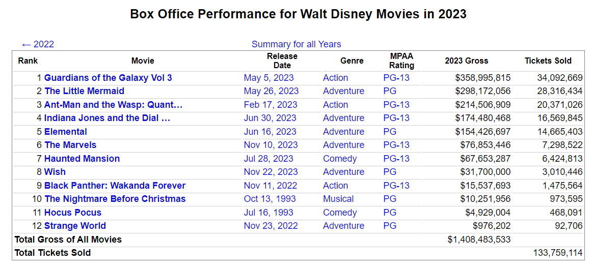 不光动画工作室,迪士尼旗下其他工作室电影的票房也在下降。除了《银河护卫队3》在北美和中国内地分别获得3.58亿美元和6.06亿元人民币的票房,几乎与前作持平外,迪士尼2023年推出的电影,无论是漫威的《惊奇队长2》《蜘蛛侠:纵横宇宙》《蚁人与黄蜂女:量子狂潮》,还是迪士尼影业本部的真人电影《小美人鱼》《幽灵鬼屋》《夺宝奇兵:命运转盘》,甚至是动画电影《疯狂元素城》,都遭遇了滑铁卢。以正在上映的《惊奇队长2》为例,该片的前作曾在全球范围内获得11.31亿美元票房,在中国内地累计票房也有10.35亿元。而《惊奇队长2》自11月10日上映至今,全球票房为1.90亿美元,中国内地累计票房仅1.10亿元。