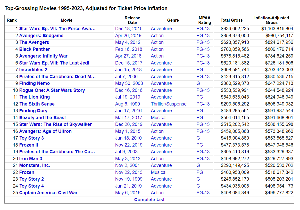 另一方面,迪士尼的IP产出后继乏力。IP是迪士尼所有业务的起点,在过去一百年里,迪士尼积累了米老鼠、迪士尼公主、疯狂动物城、漫威英雄、加勒比海盗等经典IP。但在动画电影方面,2013年的《冰雪奇缘》之后,迪士尼再也没有制造出影响力相当的动画IP。无论是后来的《寻龙传说》《魔法满屋》,还是今年上映的《疯狂元素城》在票房上都无法再续《冰雪奇缘》的奇迹。在真人电影方面,迪士尼上一个票房接近百亿美元的电影IP《复仇者联盟》完结于2019年。即使漫威英雄的IP仍然有产出的空间,但《惊奇队长2》等电影的票房在一定程度上宣告漫威英雄IP影响力的衰退。此外,据统计网站The Number数据,1995年至今,迪士尼票房前25名的电影全部上映于2020年之前。在前25名的电影中,距今最近的一部是2019年12月上映的《星球大战:天行者崛起》,这也是《星球大战》IP的完结篇。