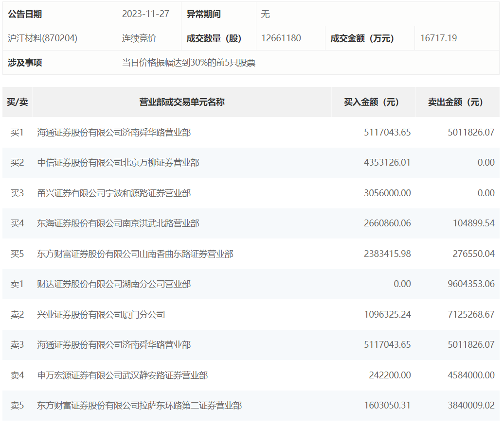 沪江材料11月27日涨29.93%,全天换手率达32.99%,振幅达35.46%。龙虎榜数据显示,营业部席位合计净卖出1003.49万元。其中,海通证券济南舜华路营业部、中信证券北京万柳证券营业部分别买入511.70万元、435.31万元;财达证券湖南分公司营业部、兴业证券厦门分公司分别卖出960.44万元、712.53万元。