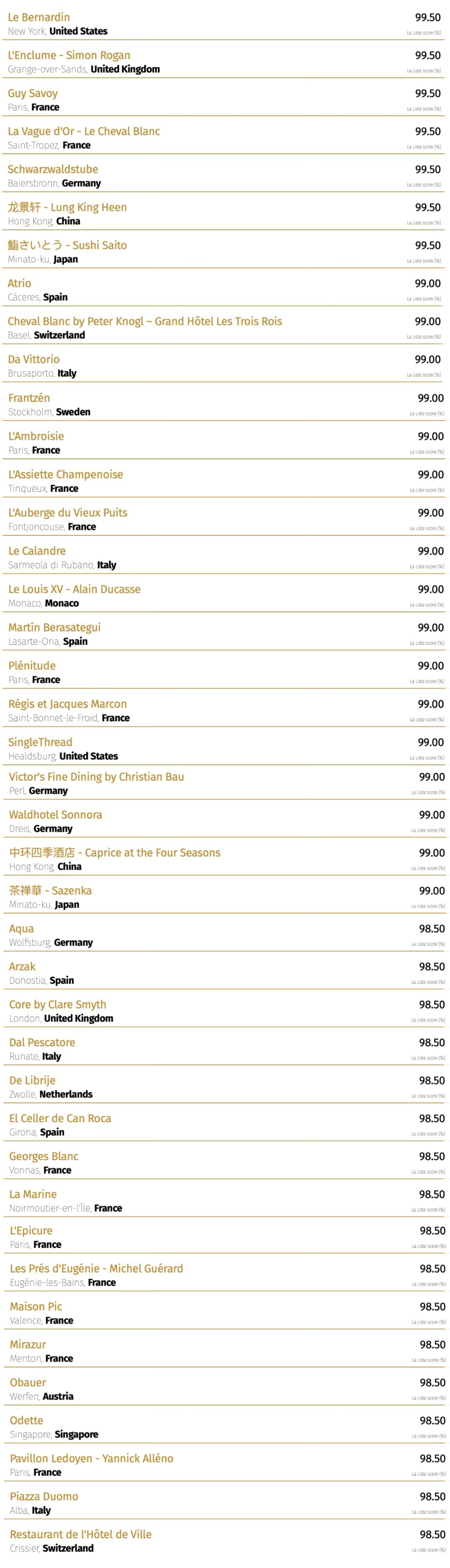 LA LISTE2024年度全球1000家最佳餐厅部分排名如下: